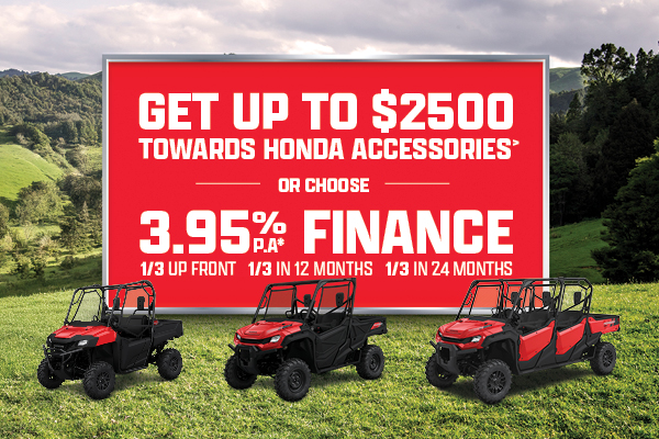 Get your next Honda farm workhorse sorted with an offer that works the way you do. For a limited time, when you purchase a selected new Honda ATV or 2 wheel farm bike, you can choose what suits your farm and your cashflow best.