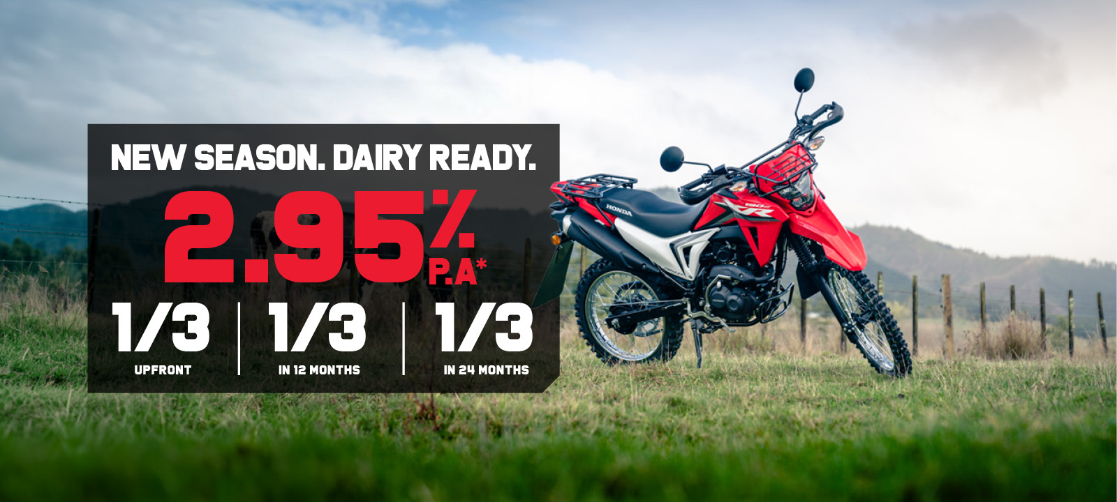 Score 2.95% 1/3 1/3 1/3 Finance* on Selected Honda Farm Bikes